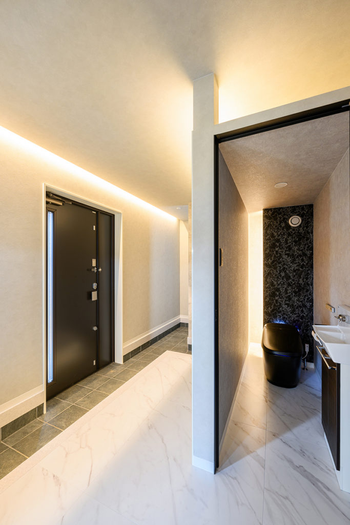 遮る柱のない視界が抜群の開放感をもたらすLDKは、奥さま好みの大理石調フロアで統一。ご主人たっての希望で取り入れた折り上げ天井は、間接照明効果でリラックスできるそうです。